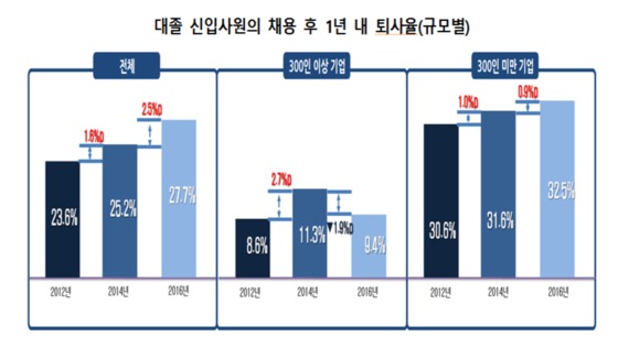 2014년 조사와 마찬가지로 300인 미만 기업(32.5%)이 300인 이상 기업(9.4%)에 비해 1년 내 퇴사율이 월등히 높게 나타났다. 양자 간 격차(2014년 20.3%p→2016년 23.1%p) 또한 확대됐다.