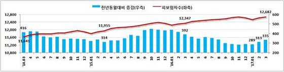 사업장 규모별 증가율은 300인 미만 2.8%(25만5000명), 300인 이상 2.4%(8만명)로 중소사업체가 피보험자 증가세를 주도했다.