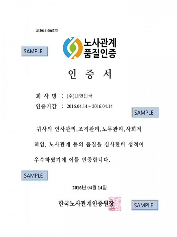 노사관계품질인증서 샘플입니다.